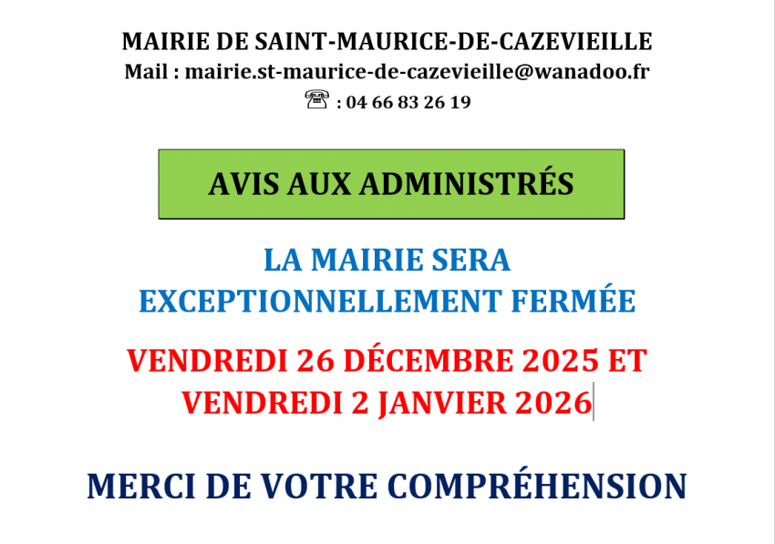 LA MAIRIE RESTERA OUVERTE PENDANT LES VACANCES SCOLAIRE UNIQUEMENT LES LUNDIS,MARDIS ET MERCREDIS.